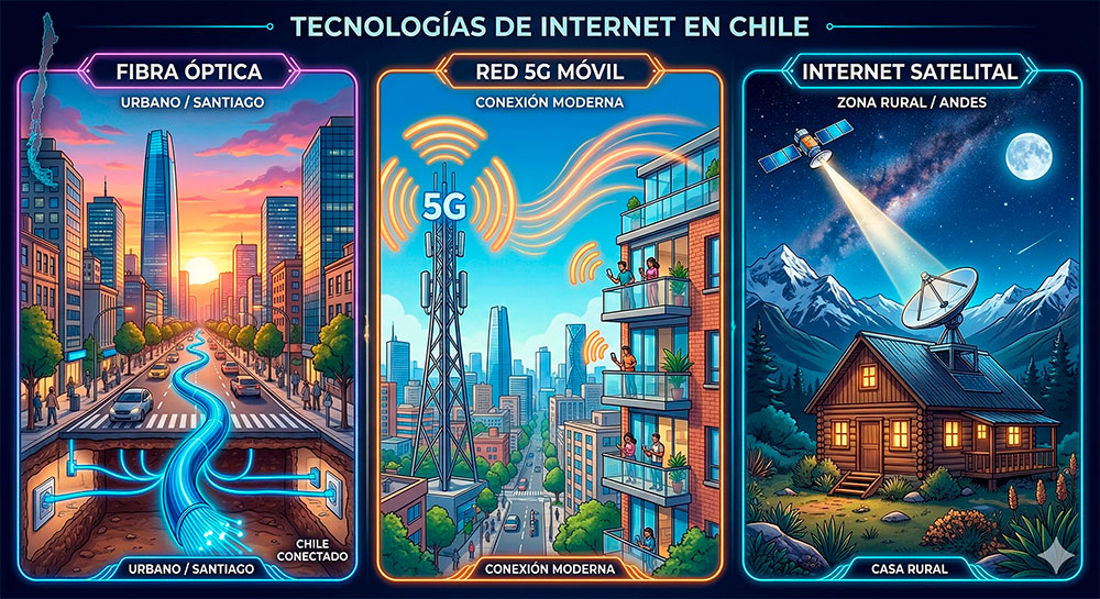 Para el 80% de los hogares chilenos urbanos, la fibra óptica simétrica (misma velocidad de subida y bajada) es la opción predeterminada. Chile sigue liderando los rankings mundiales de velocidad gracias a esta tecnología.